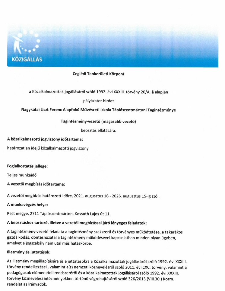 Tagintézmény:   Nagykátai Liszt Ferenc Alapfokú Művészeti Iskola Tápiószentmártoni Tagintézménye